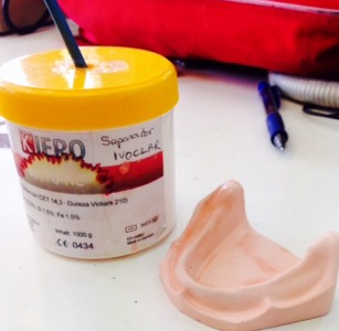 - Después del vaciado de la impresión, procedemos a echar dos capas de separador escayola-resina con un pincel; entre capa y capa hay que dejar secar muy bien el aislante.