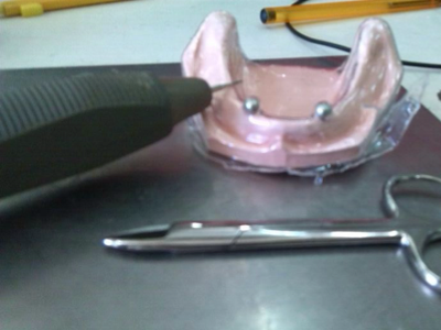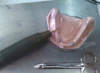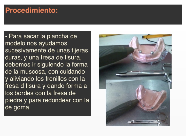 - Para sacar la plancha de modelo nos ayudamos sucesivamente de unas tijeras duras, y una fresa de fisura, debemos ir siguiendo la forma de la muscosa, con cuidando y aliviando los frenillos con la fresa d fisura y dando forma a los bordes con la fresa de piedra y para redondear con la de goma