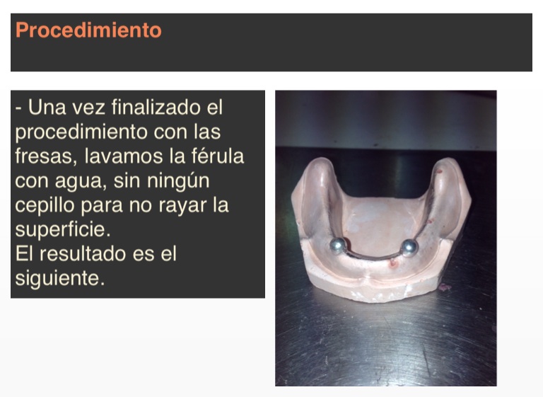 - Una vez finalizado el procedimiento con las fresas, lavamos la fĂ©rula con agua, sin ningĂșn cepillo para no rayar la superficie.