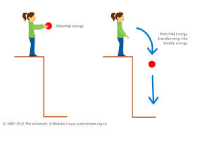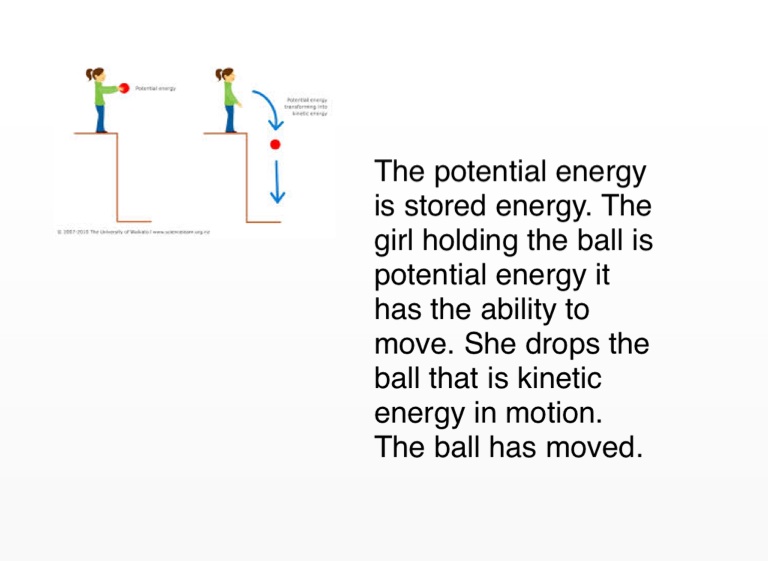 The potential energy is stored energy. The girl holding the ball is potential energy it has the ability to move. She drops the ball that is kinetic energy in motion. The ball has moved.
