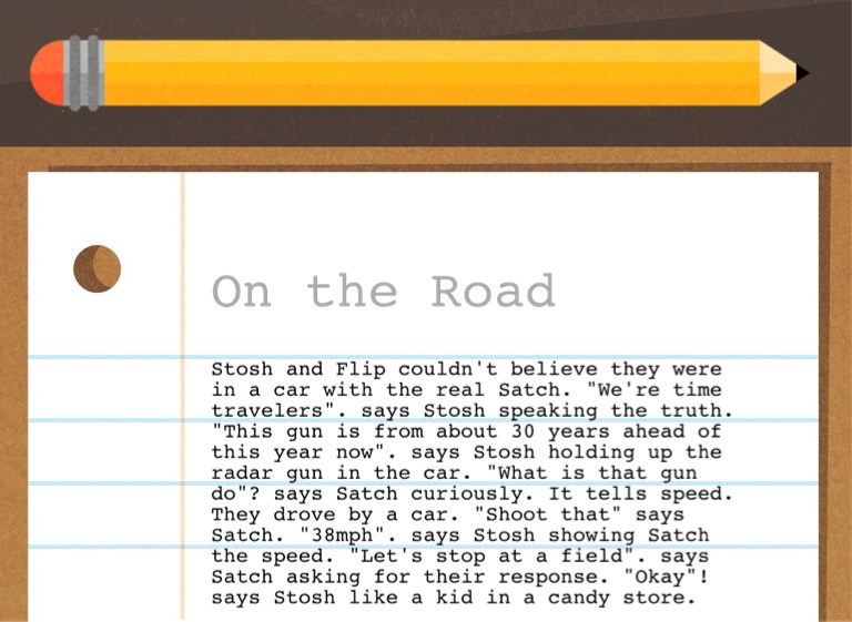 Stosh and Flip couldn't believe they were in a car with the real Satch. "We're time travelers". says Stosh speaking the truth. "This gun is from about 30 years ahead of this year now". says Stosh holding up the radar gun in the car. "What is that gun do"? says Satch curiously. It tells speed. They drove by a car. "Shoot that" says Satch. "38mph". says Stosh showing Satch the speed. "Let's stop at a field". says Satch asking for their response. "Okay"! says Stosh like a kid in a candy store.