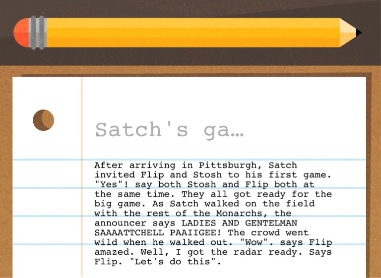 After arriving in Pittsburgh, Satch invited Flip and Stosh to his first game. "Yes"! say both Stosh and Flip both at the same time. They all got ready for the big game. As Satch walked on the field with the rest of the Monarchs, the announcer says LADIES AND GENTELMAN SAAAATTCHELL PAAIIGEE! The crowd went wild when he walked out. "Wow". says Flip amazed. Well, I got the radar ready. Says Flip. "Let's do this".