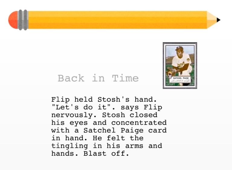 Flip held Stosh's hand. "Let's do it". says Flip nervously. Stosh closed his eyes and concentrated with a Satchel Paige card in hand. He felt the tingling in his arms and hands. Blast off.