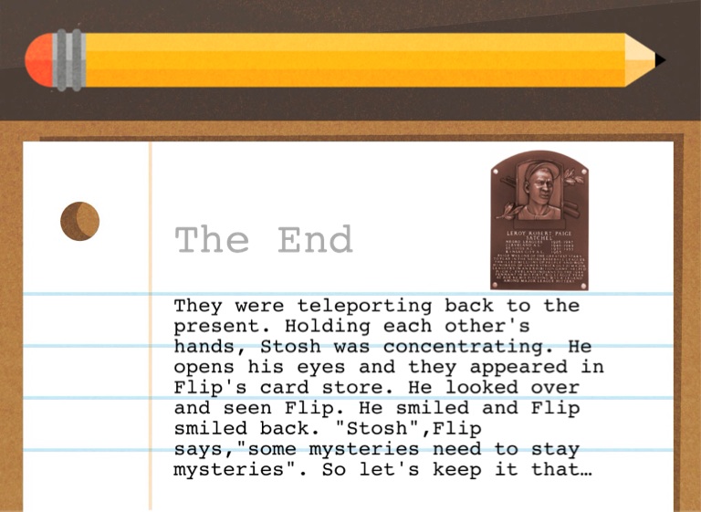 They were teleporting back to the present. Holding each other's hands, Stosh was concentrating. He opens his eyes and they appeared in Flip's card store. He looked over and seen Flip. He smiled and Flip smiled back. "Stosh",Flip says,"some mysteries need to stay mysteries". So let's keep it that way". The End.