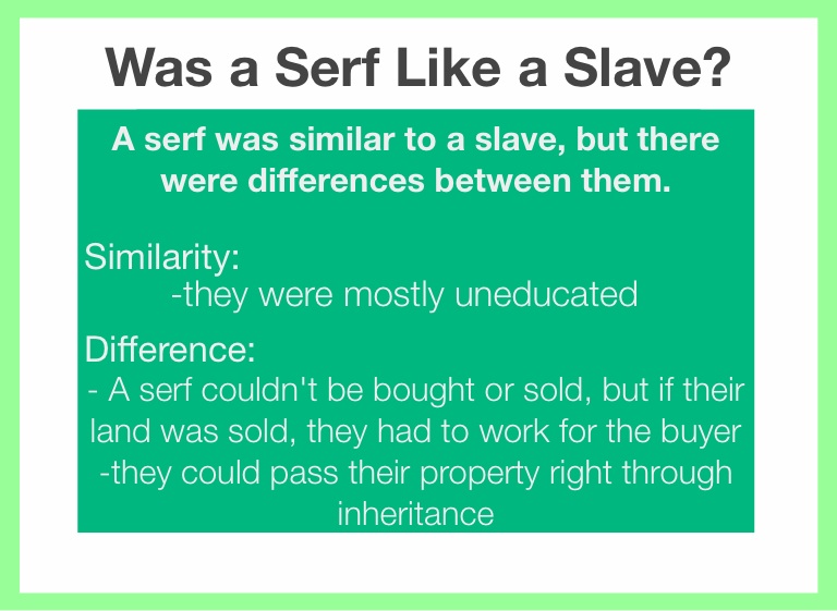 - A serf couldn't be bought or sold, but if their land was sold, they had to work for the buyer