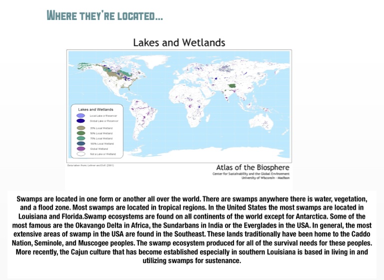 Swamps are located in one form or another all over the world. There are swamps anywhere there is water, vegetation, and a flood zone. Most swamps are located in tropical regions. In the United States the most swamps are located in Louisiana and Florida.Swamp ecosystems are found on all continents of the world except for Antarctica. Some of the most famous are the Okavango Delta in Africa, the Sundarbans in India or the Everglades in the USA. In general, the most extensive areas of swamp in the USA are found in the Southeast. These lands traditionally have been home to the Caddo Nation, Seminole, and Muscogee peoples. The swamp ecosystem produced for all of the survival needs for these peoples. More recently, the Cajun culture that has become established especially in southern Louisiana is based in living in and utilizing swamps for sustenance.