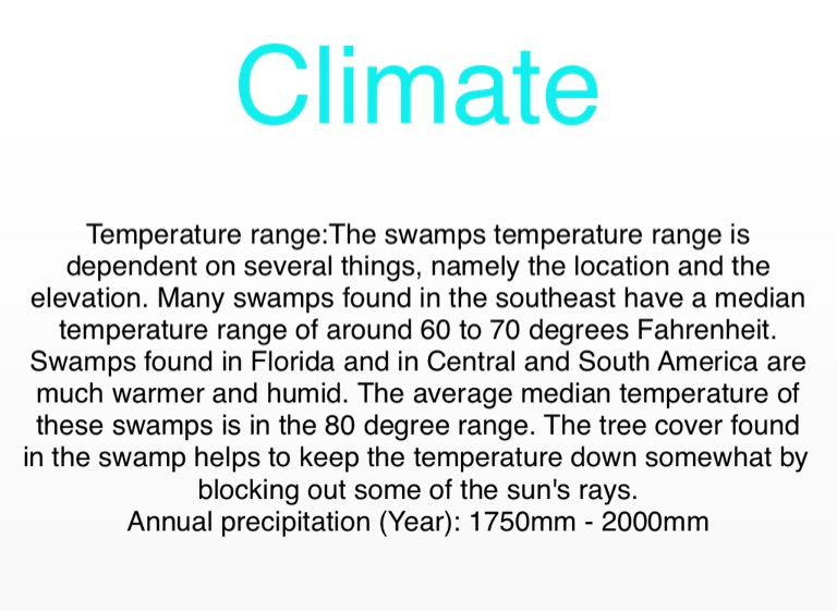 Temperature range:The swamps temperature range is dependent on several things, namely the location and the elevation. Many swamps found in the southeast have a median temperature range of around 60 to 70 degrees Fahrenheit. Swamps found in Florida and in Central and South America are much warmer and humid. The average median temperature of these swamps is in the 80 degree range. The tree cover found in the swamp helps to keep the temperature down somewhat by blocking out some of the sun's rays.