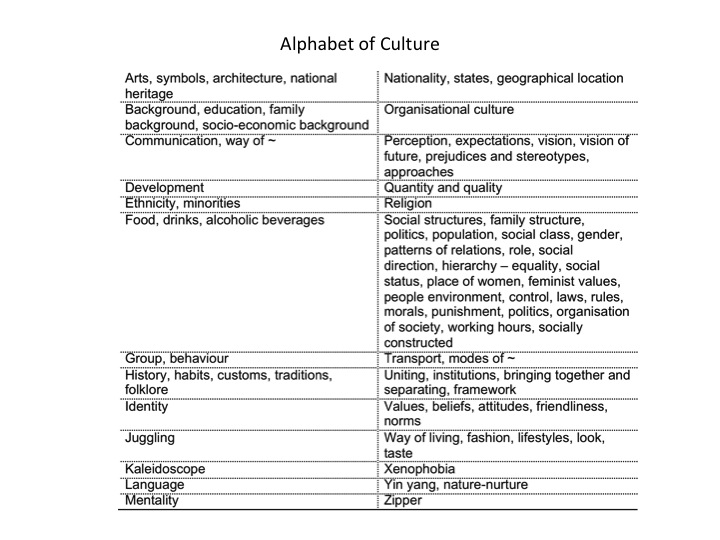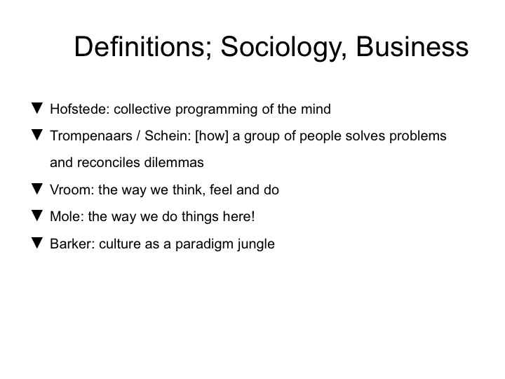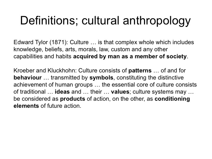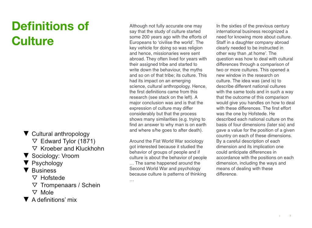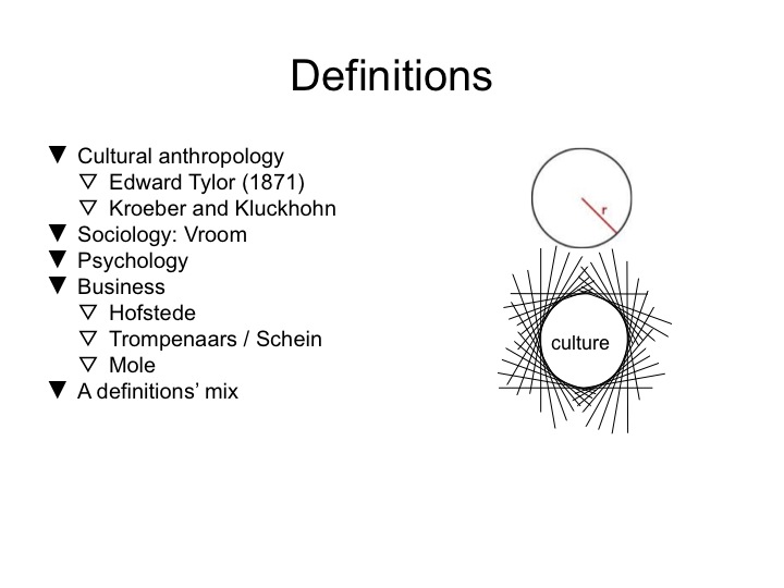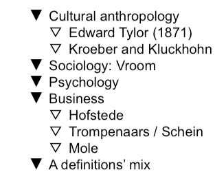Although not fully accurate one may say that the study of culture started some 200 years ago with the efforts of Europeans to ‘civilise the world’. The key vehicle for doing so was religion and hence, missionaries were sent abroad. They often lived for years with their assigned tribe and started to write down the behaviour, the myths and so on of that tribe; its culture. This had its impact on an emerging science, cultural anthropology. Hence, the first definitions came from this research (see stack on the left). A major conclusion was and is that the expression of culture may differ considerably but that the process shows many similarities (e.g. trying to find an answer to why man is on earth and where s/he goes to after death).