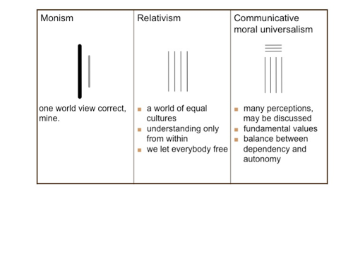 According to Van Asperen (and in line with the findings of cultural anthropology) people may show three basic perceptions of culture. The first is monism or 'my culture is better’, the idea of superiority of one culture over another. An example is the attitude of Europeans vis-à -vis the rest of the world over a century ago; but also the attitude of some politicians in the West regarding the Islam.