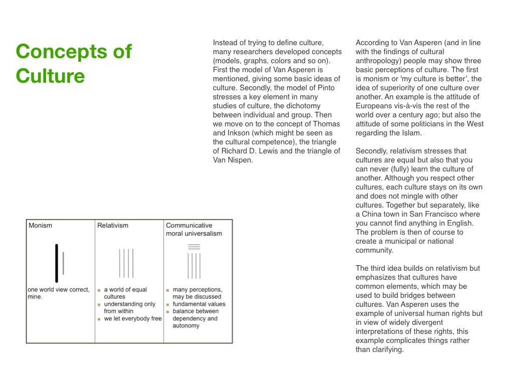 Instead of trying to define culture, many researchers developed concepts (models, graphs, colors and so on). First the model of Van Asperen is mentioned, giving some basic ideas of culture. Secondly, the model of Pinto stresses a key element in many studies of culture, the dichotomy between individual and group. Then we move on to the concept of Thomas and Inkson (which might be seen as the cultural competence), the triangle of Richard D. Lewis and the triangle of Van Nispen.
