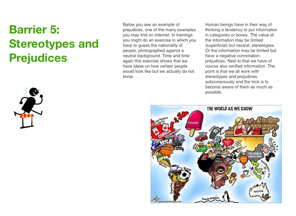 Human beings have in their way of thinking a tendency to put information in categories or boxes. The value of the information may be limited (superficial) but neutral; stereotypes. Or the information may be limited but have a negative connotation; prejudices. Next to that we have of course also verified information. The point is that we all work with stereotypes and prejudices, subconsciously and the trick is to become aware of them as much as possible.