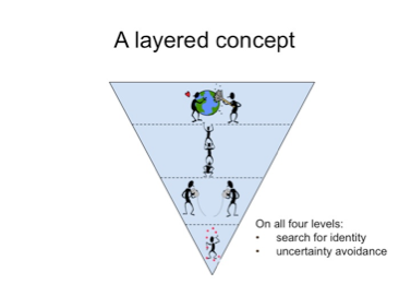 Between the four layers you see dotted lines because the individual moves across those lines all the time. The same applies to the research on culture. The different approaches may be divided over the four layers but not in a rigid way.