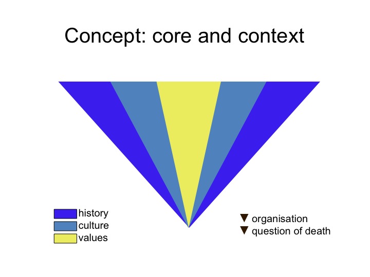 In the stack you also see two examples of the complexity of culture at the individual level. The second picture (developed by Hofman, adjusted) shows some of the groups an individual is a member of. The third picture puts all paradigms at the individual level in a cultural backpack. If an individual comes in a new situation, s/he will look in this backpack to see whether a suitable paradigm is already available. If so, fine; otherwise a paradigm needs to be developed, whatever the effort its costs. The fourth picture shows the relation between culture and civilisation. Culture enables people to accept the organisation of society and answers ’the question of death’: where are we coming from, why are we here on Earth and where are we going to after our death? Finally, in the fifth picture the concept is summarised, including the idea of internal and external culture (a culture you are a member of).