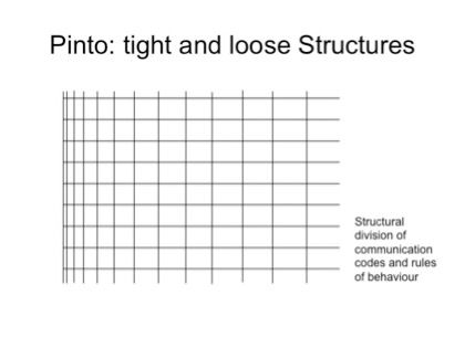 A key theme in the research on culture is the degree in which people are focused on the individual or on the group. Prof. Pinto takes this as the core of his concept of culture and talks about tight and loose structures. A tight structure equals a group oriented culture. In such a culture the focus is on the position of the group in society and the individual person has to contribute to the enhancement of that position. In a somewhat extreme way one may say that the group determines all and everything; what school you are going to, what job you are going to do, which partner to marry and what house to live in. The individual is boxed in, a tight culture.