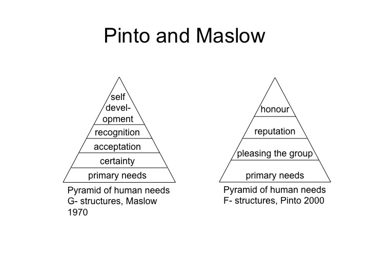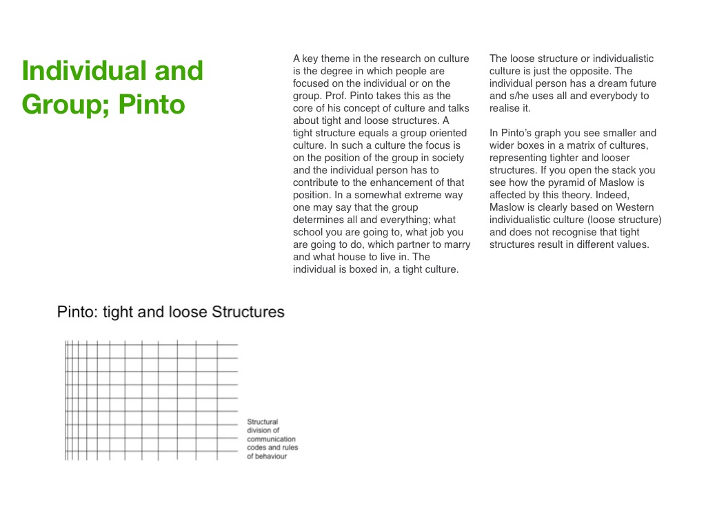 In Pinto’s graph you see smaller and wider boxes in a matrix of cultures, representing tighter and looser structures. If you open the stack you see how the pyramid of Maslow is affected by this theory. Indeed, Maslow is clearly based on Western individualistic culture (loose structure) and does not recognise that tight structures result in different values.