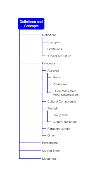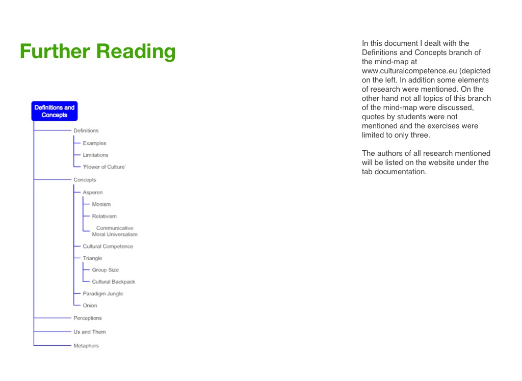 In this document I dealt with the Definitions and Concepts branch of the mind-map at www.culturalcompetence.eu (depicted on the left. In addition some elements of research were mentioned. On the other hand not all topics of this branch of the mind-map were discussed, quotes by students were not mentioned and the exercises were limited to only three.