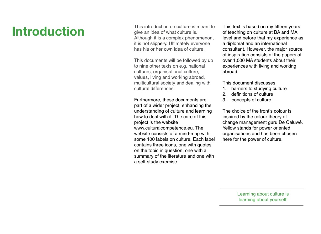This text is based on my fifteen years of teaching on culture at BA and MA level and before that my experience as a diplomat and an international consultant. However, the major source of inspiration consists of the papers of over 1,000 MA students about their experiences with living and working abroad.