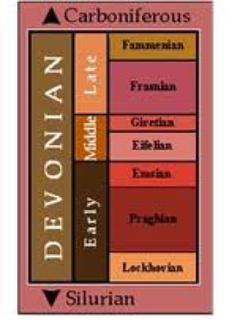 It is between the Silurian time period and the Carboniferous time period It is in the Paleozoic era