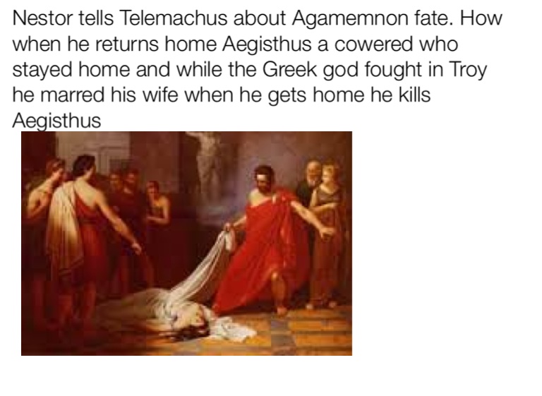 Nestor tells Telemachus about Agamemnon fate. How when he returns home Aegisthus a cowered who stayed home and while the Greek god fought in Troy he marred his wife when he gets home he kills Aegisthus