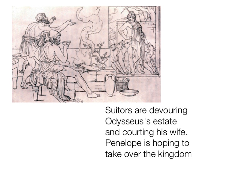 Suitors are devouring Odysseus's estate and courting his wife. Penelope is hoping to take over the kingdom