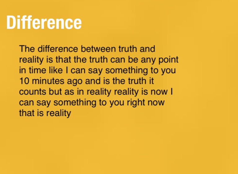 The difference between truth and reality is that the truth can be any point in time like I can say something to you 10 minutes ago and is the truth it counts but as in reality reality is now I can say something to you right now that is reality