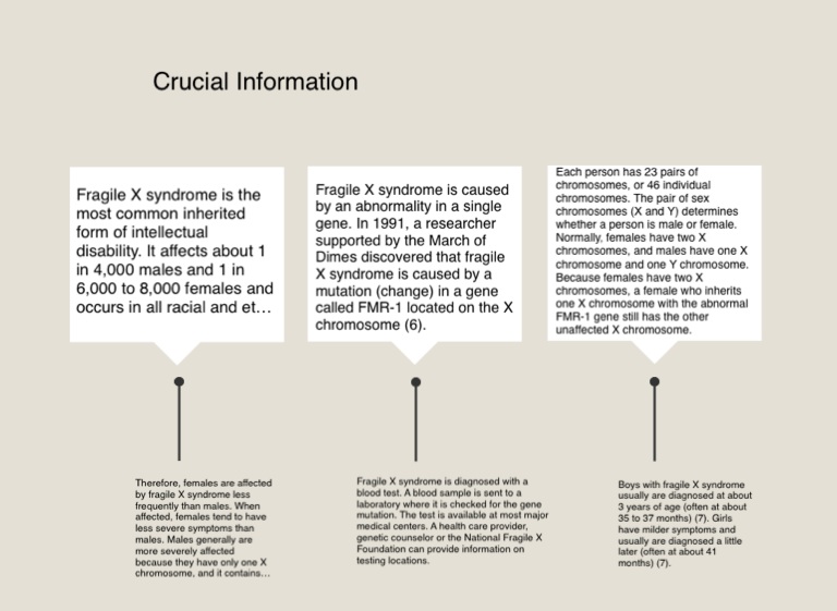 Boys with fragile X syndrome usually are diagnosed at about 3 years of age (often at about 35 to 37 months) (7). Girls have milder symptoms and usually are diagnosed a little later (often at about 41 months) (7).