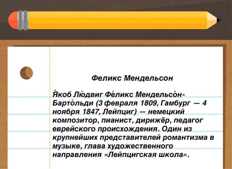 Я́коб Лю́двиг Фе́ликс Мендельсо́н-Барто́льди (3 февраля 1809, Гамбург — 4 ноября 1847, Лейпциг) — немецкий композитор, пианист, дирижёр, педагог еврейского происхождения. Один из крупнейших представителей романтизма в музыке, глава художественного направления «Лейпцигская школа».