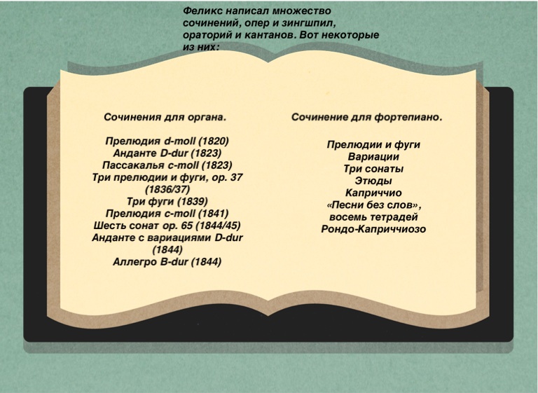Феликс написал множество сочинений, опер и зингшпил, ораторий и кантанов. Вот некоторые из них: