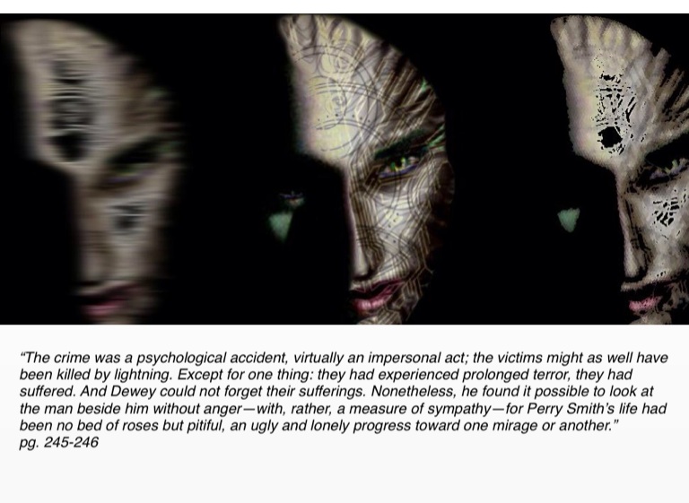 “The crime was a psychological accident, virtually an impersonal act; the victims might as well have been killed by lightning. Except for one thing: they had experienced prolonged terror, they had suffered. And Dewey could not forget their sufferings. Nonetheless, he found it possible to look at the man beside him without anger—with, rather, a measure of sympathy—for Perry Smith’s life had been no bed of roses but pitiful, an ugly and lonely progress toward one mirage or another.”