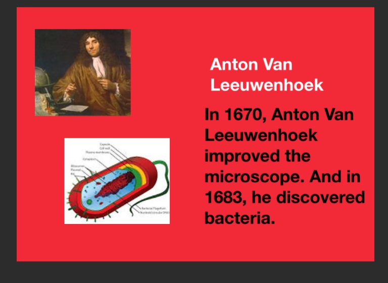 In 1670, Anton Van Leeuwenhoek improved the microscope. And in 1683, he discovered bacteria.