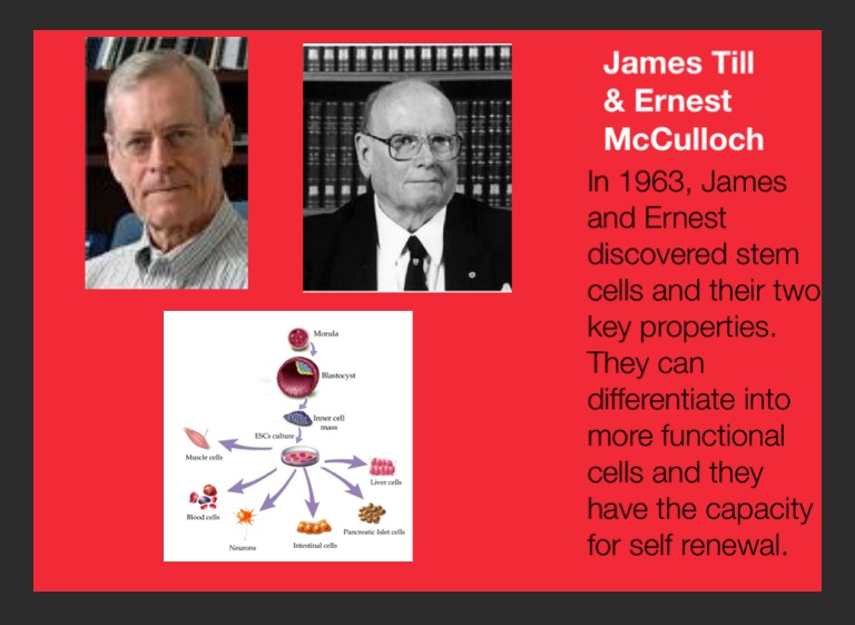 In 1963, James and Ernest discovered stem cells and their two key properties. They can differentiate into more functional cells and they have the capacity for self renewal.