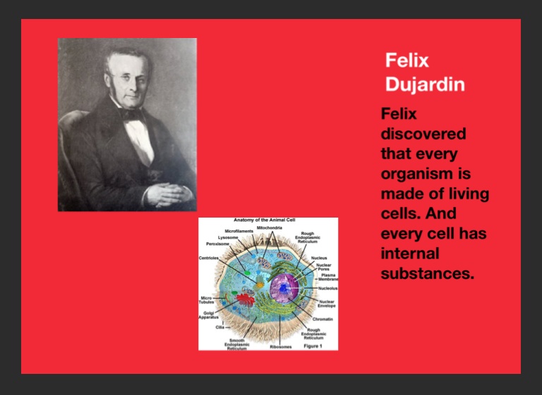 Felix discovered that every organism is made of living cells. And every cell has internal substances.