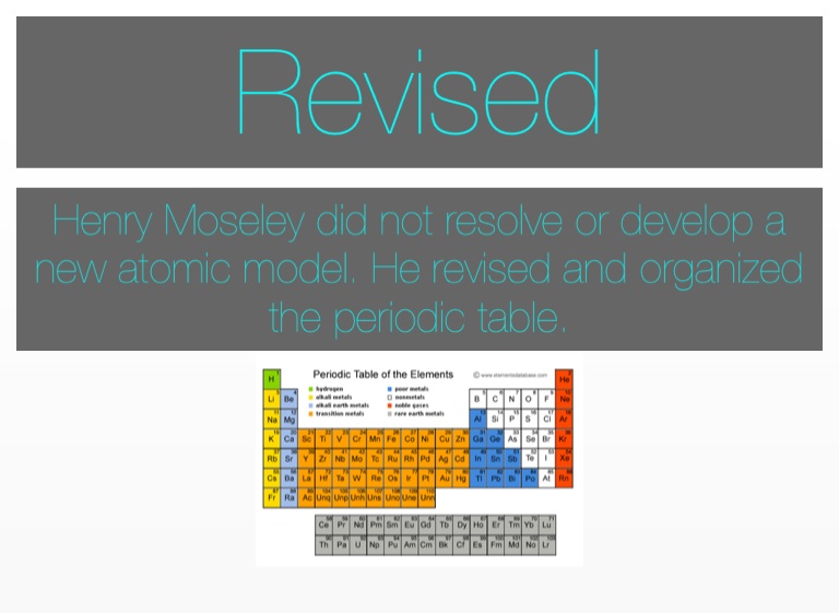 Henry Moseley did not resolve or develop a new atomic model. He revised and organized the periodic table.