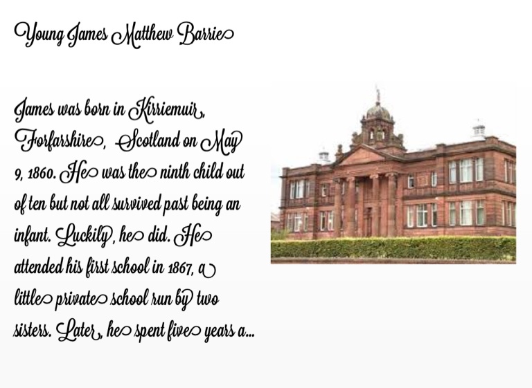 James was born in Kirriemuir, Forfarshire, Scotland on May 9, 1860. He was the ninth child out of ten but not all survived past being an infant. Luckily, he did. He attended his first school in 1867, a little private school run by two sisters. Later, he spent five years at the Dumfries Academy.