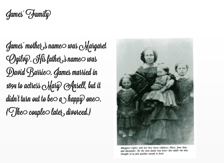 James' mother's name was Margaret Ogilvy. His father's name was David Barrie. James married in 1894 to actress Mary Ansell, but it didn't turn out to be a happy one. (The couple later divorced.)