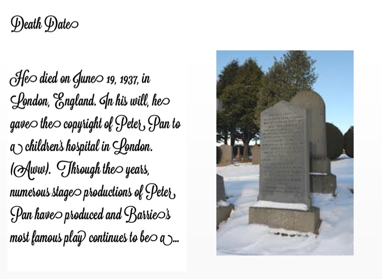 He died on June 19, 1937, in London, England. In his will, he gave the copyright of Peter Pan to a children's hospital in London. (Aww). Through the years, numerous stage productions of Peter Pan have produced and Barrie's most famous play continues to be a favorite with young and old alike.