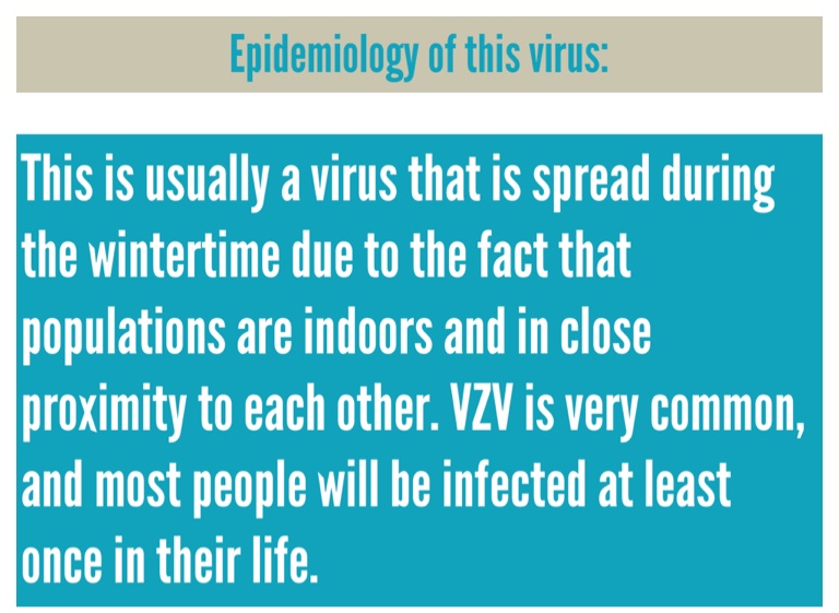 This is usually a virus that is spread during the wintertime due to the fact that populations are indoors and in close proximity to each other. VZV is very common, and most people will be infected at least once in their life.