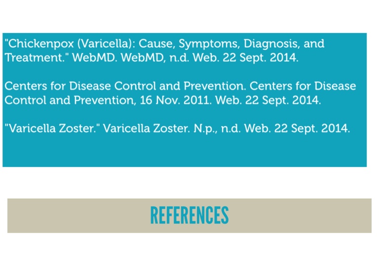 "Chickenpox (Varicella): Cause, Symptoms, Diagnosis, and Treatment." WebMD. WebMD, n.d. Web. 22 Sept. 2014.