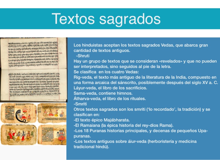Los hinduistas aceptan los textos sagrados Vedas, que abarca gran cantidad de textos antiguos.