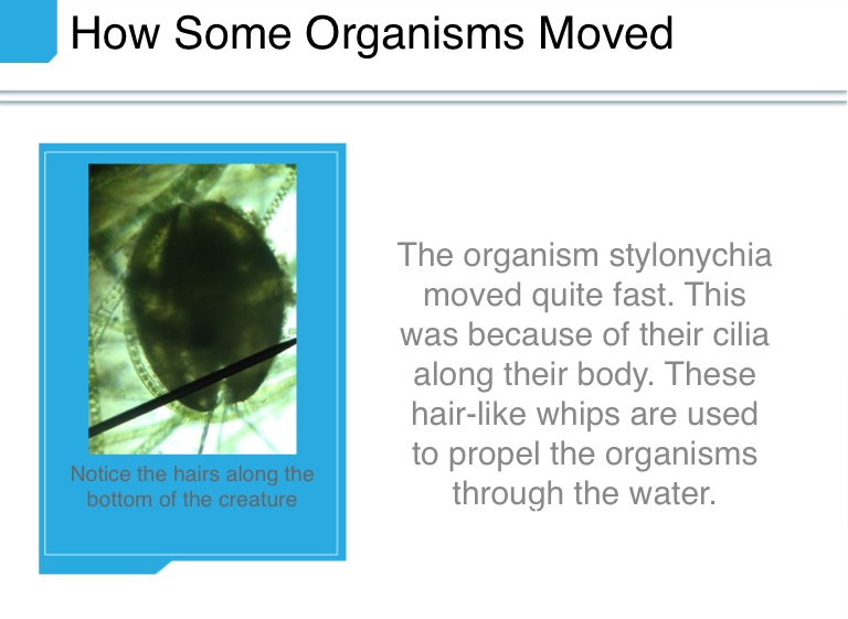 The organism stylonychia moved quite fast. This was because of their cilia along their body. These hair-like whips are used to propel the organisms through the water.