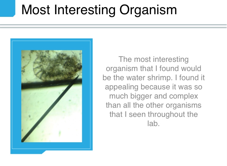 The most interesting organism that I found would be the water shrimp. I found it appealing because it was so much bigger and complex than all the other organisms that I seen throughout the lab.