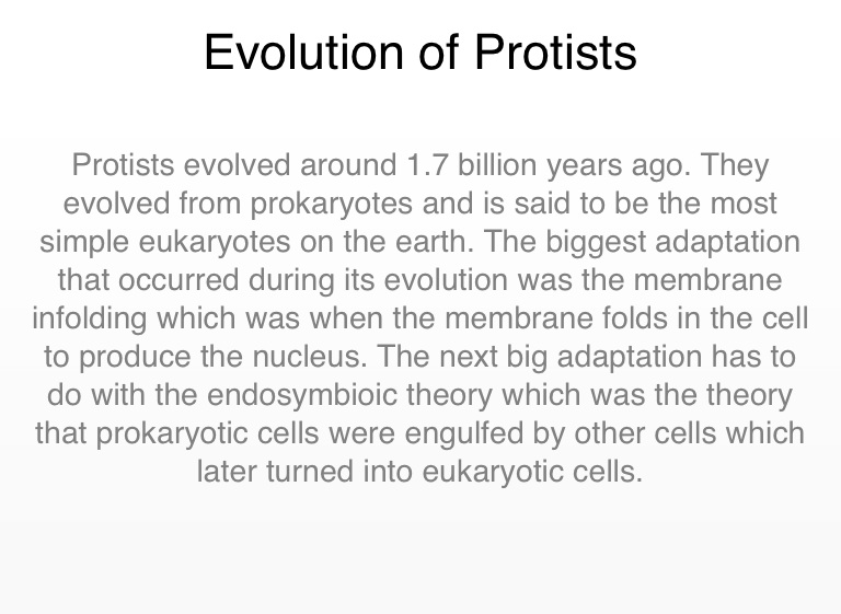 Protists evolved around 1.7 billion years ago. They evolved from prokaryotes and is said to be the most simple eukaryotes on the earth. The biggest adaptation that occurred during its evolution was the membrane infolding which was when the membrane folds in the cell to produce the nucleus. The next big adaptation has to do with the endosymbioic theory which was the theory that prokaryotic cells were engulfed by other cells which later turned into eukaryotic cells.