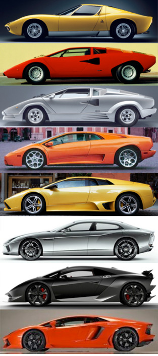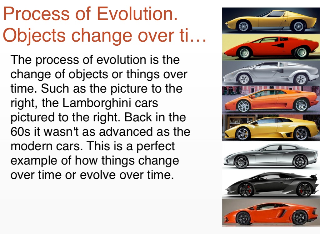 The process of evolution is the change of objects or things over time. Such as the picture to the right, the Lamborghini cars pictured to the right. Back in the 60s it wasn't as advanced as the modern cars. This is a perfect example of how things change over time or evolve over time.