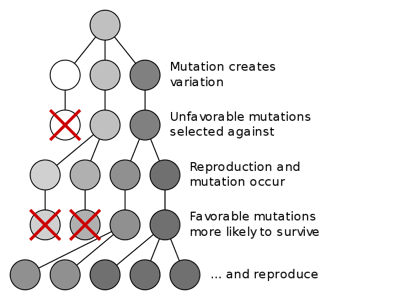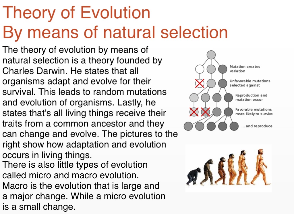 The theory of evolution by means of natural selection is a theory founded by Charles Darwin. He states that all organisms adapt and evolve for their survival. This leads to random mutations and evolution of organisms. Lastly, he states that's all living things receive their traits from a common ancestor and they can change and evolve. The pictures to the right show how adaptation and evolution occurs in living things.