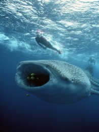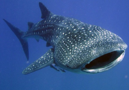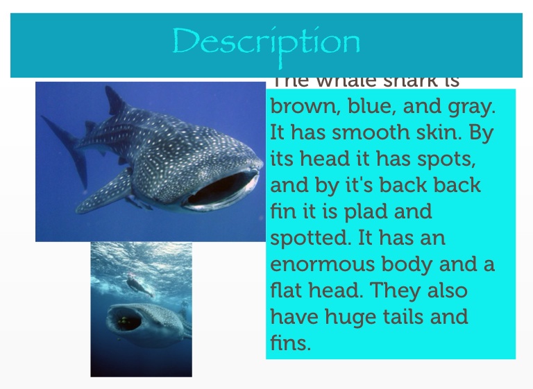 The whale shark is brown, blue, and gray. It has smooth skin. By its head it has spots, and by it's back back fin it is plad and spotted. It has an enormous body and a flat head. They also have huge tails and fins.