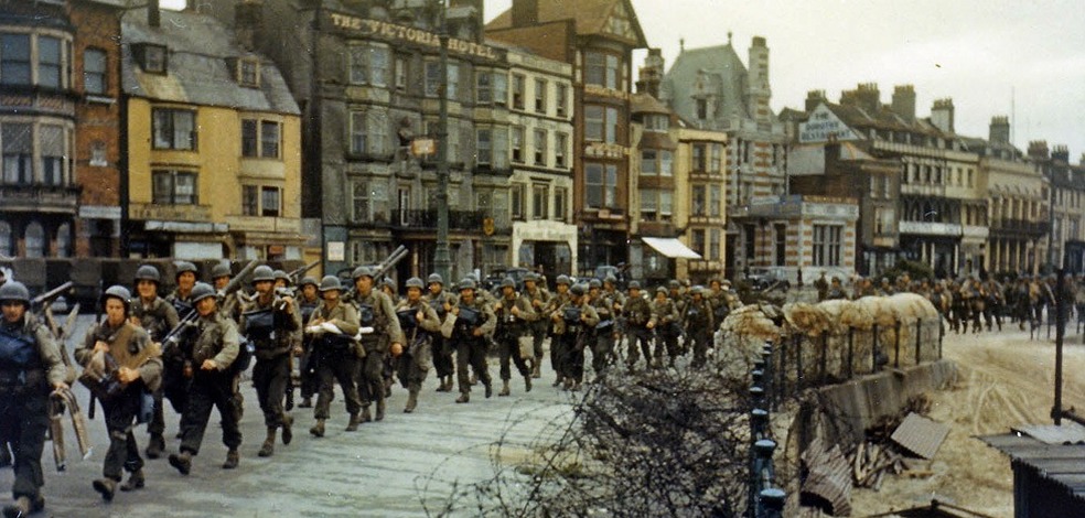 U.S. Soldiers march through an English costal town on their way to board ships for the invasion of France.