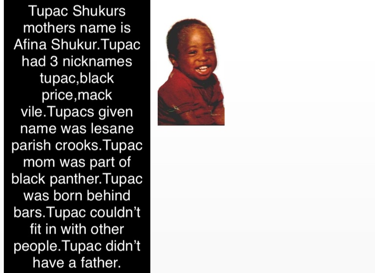 Tupac Shukurs mothers name is Afina Shukur.Tupac had 3 nicknames tupac,black price,mack vile.Tupacs given name was lesane parish crooks.Tupac mom was part of black panther.Tupac was born behind bars.Tupac couldn’t fit in with other people.Tupac didn’t have a father.
