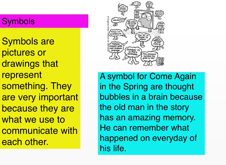 A symbol for Come Again in the Spring are thought bubbles in a brain because the old man in the story has an amazing memory. He can remember what happened on everyday of his life.