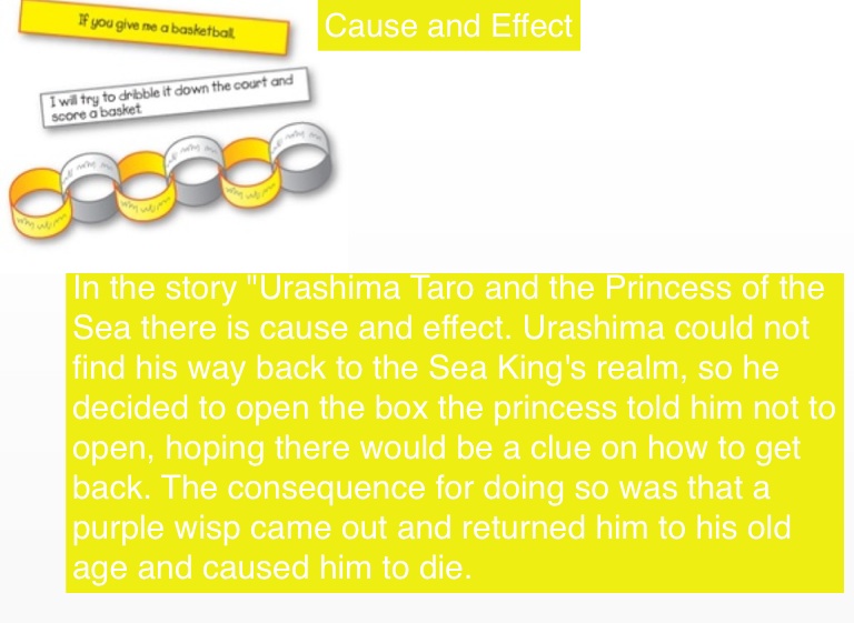 In the story "Urashima Taro and the Princess of the Sea there is cause and effect. Urashima could not find his way back to the Sea King's realm, so he decided to open the box the princess told him not to open, hoping there would be a clue on how to get back. The consequence for doing so was that a purple wisp came out and returned him to his old age and caused him to die.