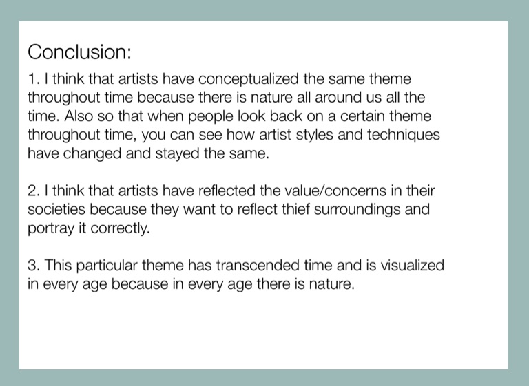 1. I think that artists have conceptualized the same theme throughout time because there is nature all around us all the time. Also so that when people look back on a certain theme throughout time, you can see how artist styles and techniques have changed and stayed the same.